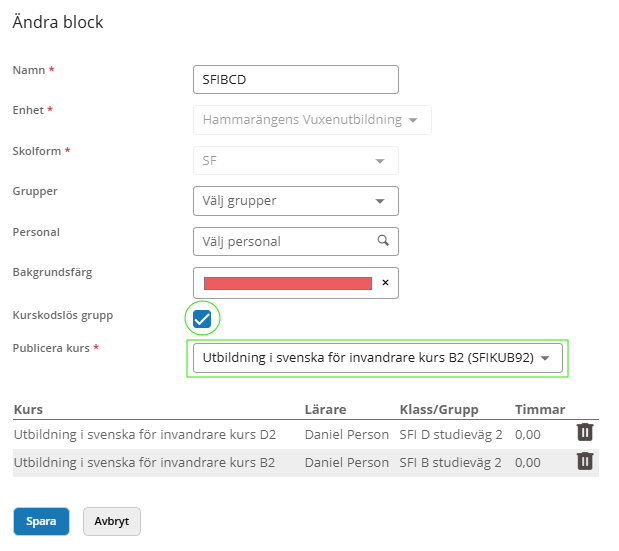 Ändringen görs i menyvalet Aktiviteter – fliken Block. Endast vald kurs under Publicera kurs visas i närvaro/frånvaro med deltagarlistan från den kurskodslösa gruppen.