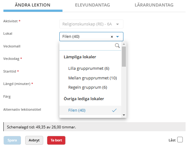 Lokalväljaren föreslår nu lediga, lämpligt stora lokaler som rymmer alla elever på lektionen (upp till maximalt dubbelt så stor). Exemplet nedan visar lämpliga lokaler för en grupp på sex elever.