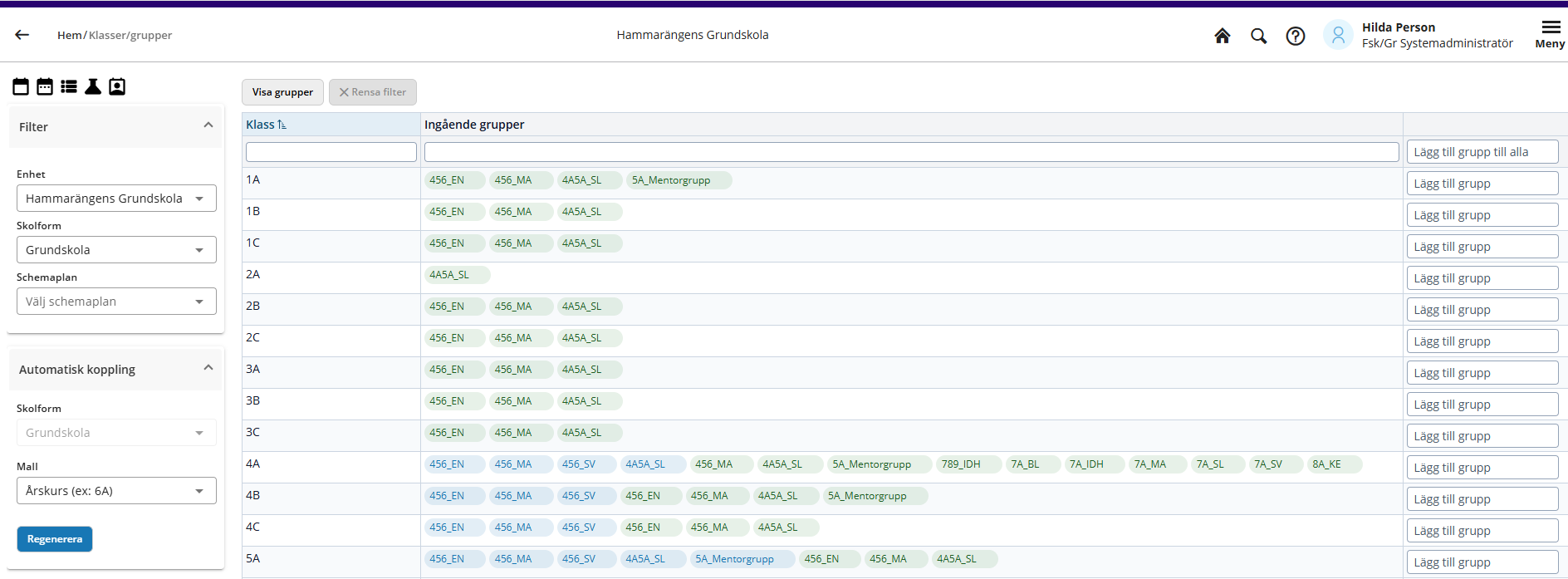 Kopplingar mellan grupper och klasser visas i kolumnen Ingående grupper. Blå kopplingar har skapats automatiskt, gröna är manuellt tillagda och grå är borttagna automatiska kopplingar.