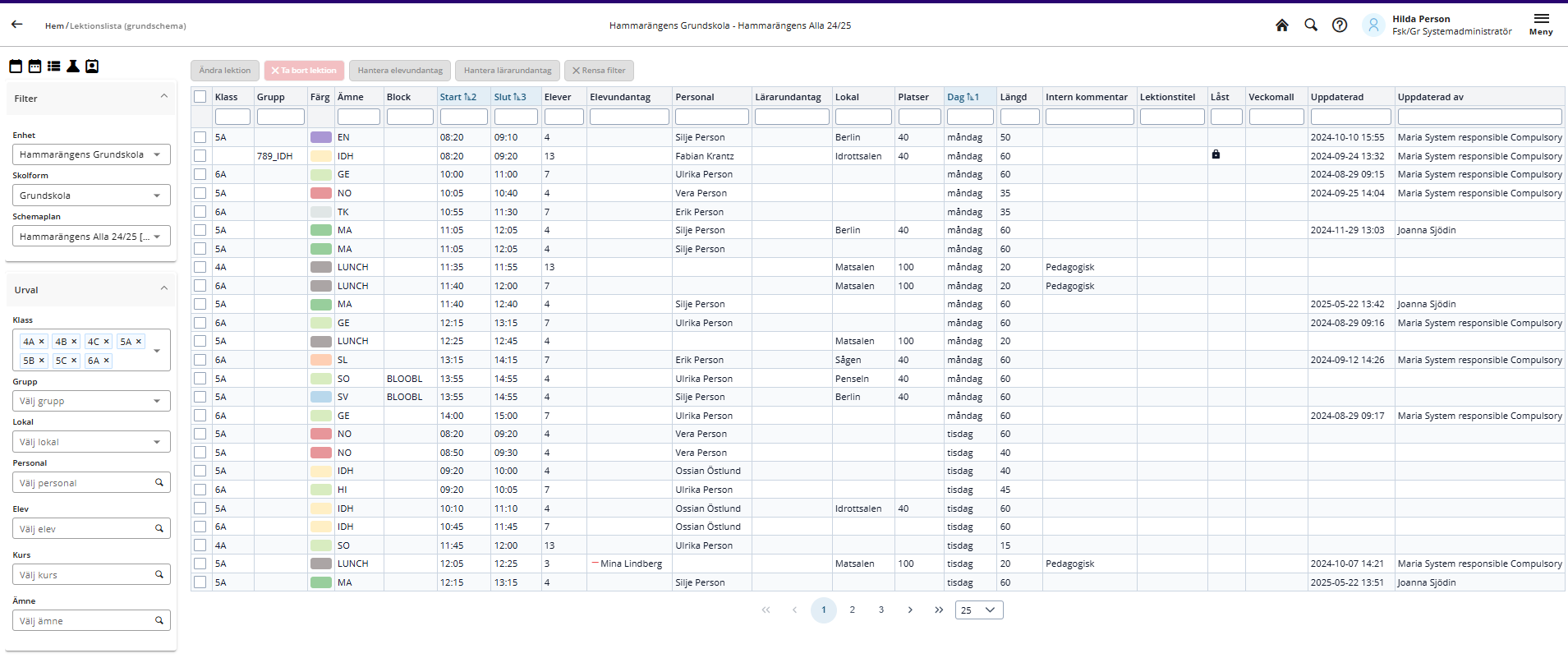 Det nya menyvalet Lektionslista (grundschema) ger dig möjlighet att se och massändra grundschemalektioner i en smidig listvy med urval och filtermöjligheter.