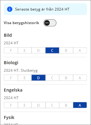 När det finns tidigare betyg i något av ämnena kan du välja att visa betygshistorik.