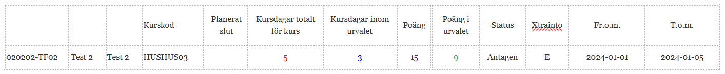 Kursdagar inom urvalet: 3 – Här räknas urvalets Fr.o.m. datum vilket i exemplet är: 2025-01-03 och T.o.m. 2025-01-05 (kursdeltagarens Fr.o.m. datum 2025-01-01 är tidigare än urvalets Fr.o.m. datum därför används urvalets Fr.o.m. datum)