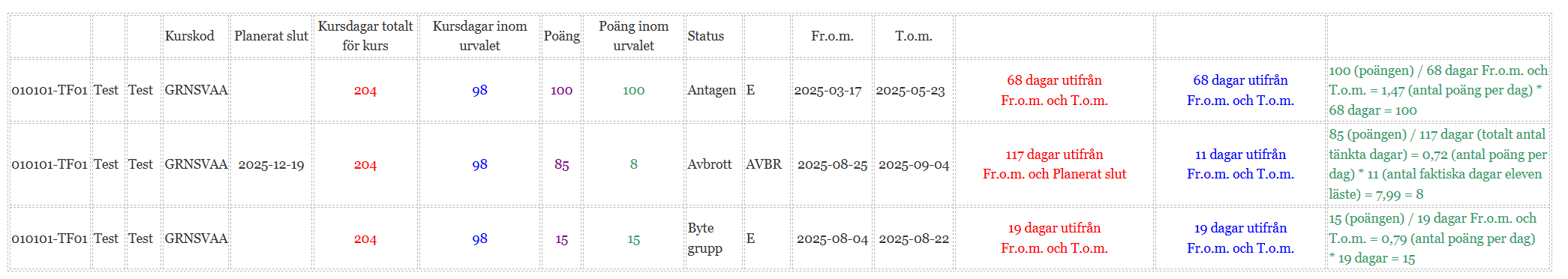 Poäng inom urvalet: 15 (poäng) /5 (kursdagar totalt för kurs) * (kursdagar inom urvalet) = 9