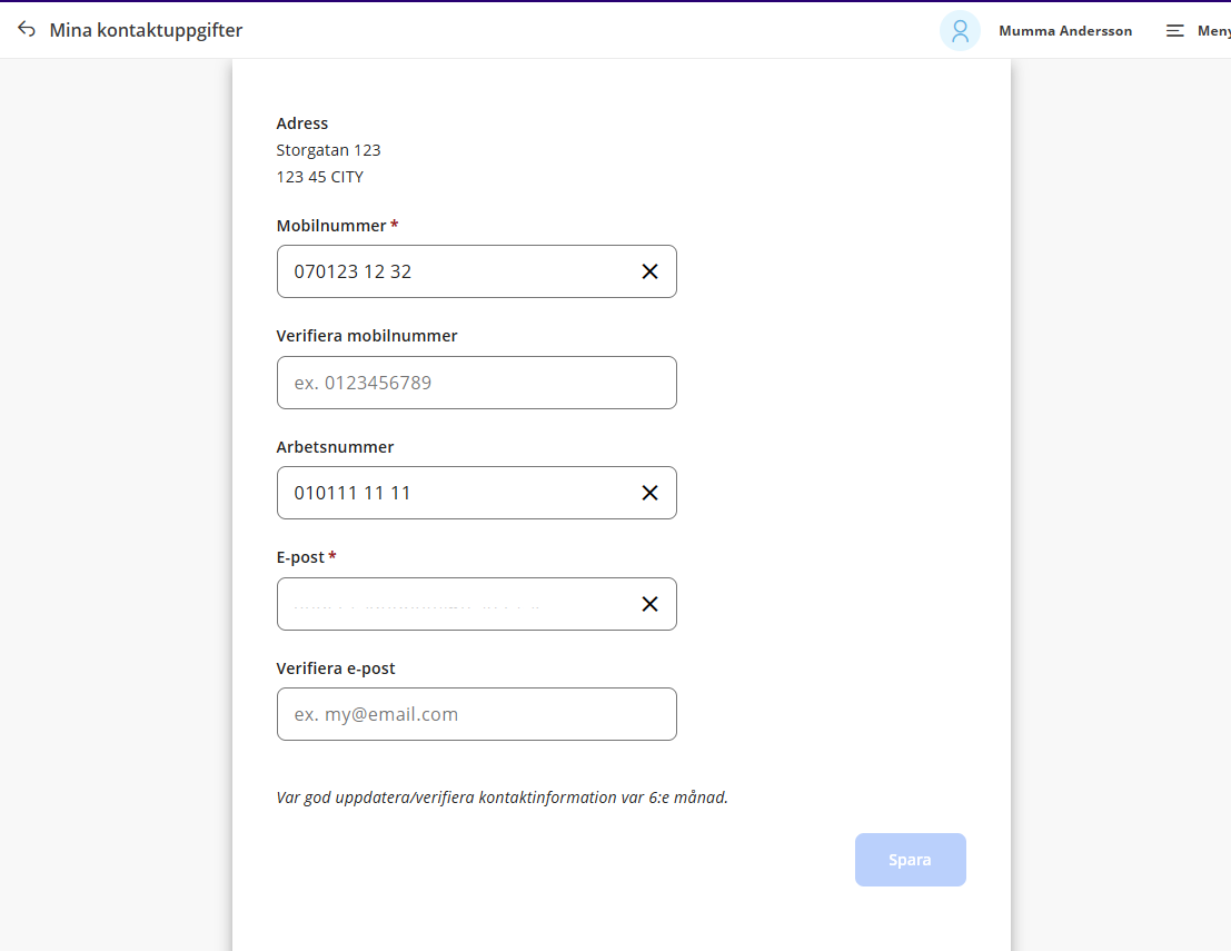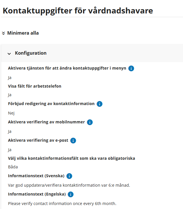 Förbjud redigering av kontaktinformation | Visar enbart kontaktinformation, ingen ändring möjlig. Används t.ex. om annan e-tjänst används för att ange kontaktuppgifter. Kan kombineras med informationstext (se nedan) som gör att användaren förstår var den ska uppdatera sina kontaktuppgifter.